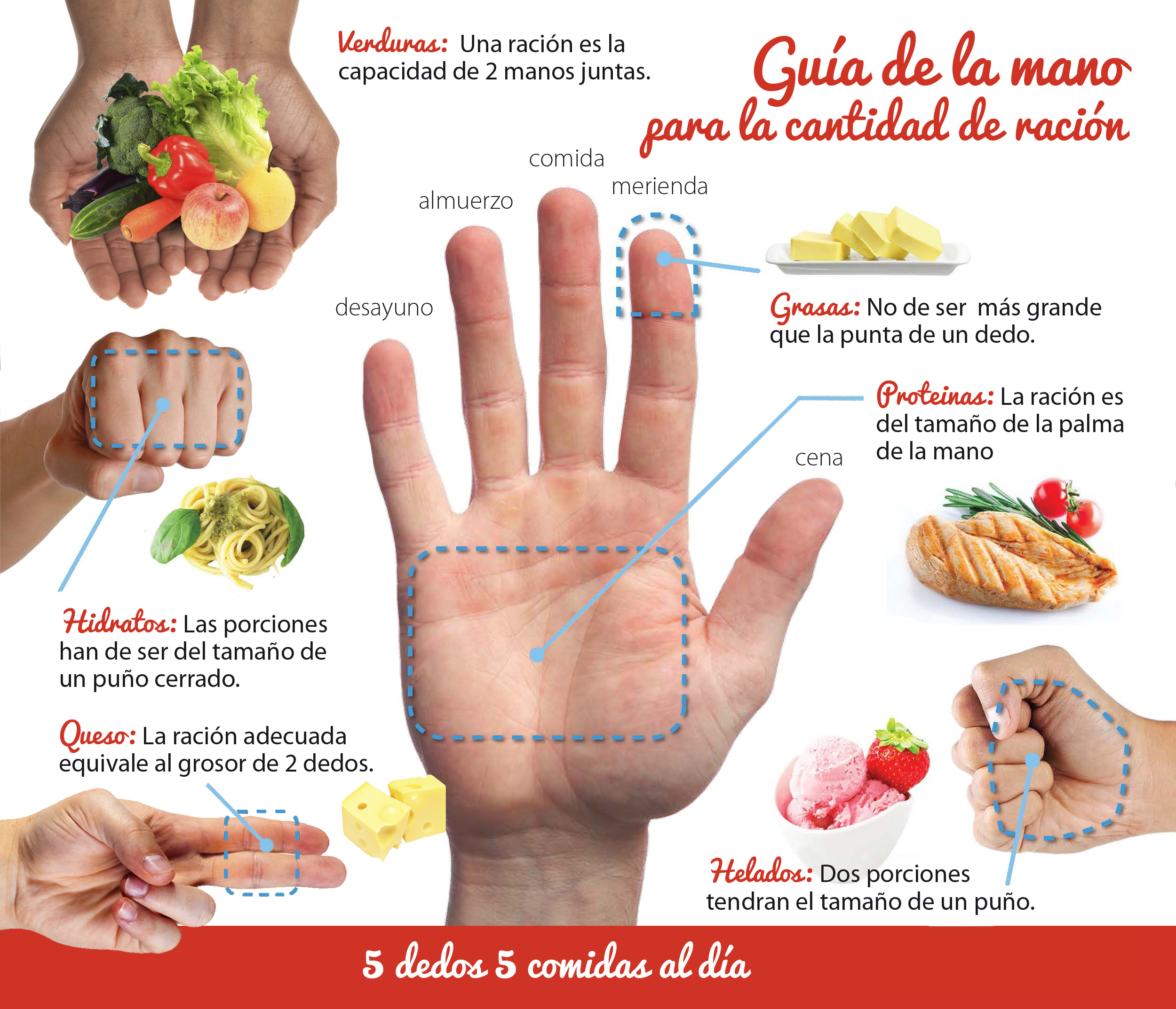 Respeta los horarios de comida; aumenta el consumo de fibra proveniente de alimentos; date tiempo para masticar con calma; incluye verduras en todos los tiempos de comida; modera el consumo de carne roja, de preferencia opta por pescado o pollo sin piel, y ten en cuenta el tamaño de las porciones. Puedes utilizar tus manos para medir las porciones de alimentos, así, una porción de fruta es tu puño cerrado, una porción de verduras son tus dos palmas juntas y ahuecadas; la carne, pollo, pescado, ternera o atún es una palma con el grosor del dedo menique; pasta arroz, avena, frijol, haba o lentejas es una palma ahuecada; bebidas un puño; y aceite, mantequilla, mayonesa, crema, azúcar o miel es un pulgar. ¡Cuídate!