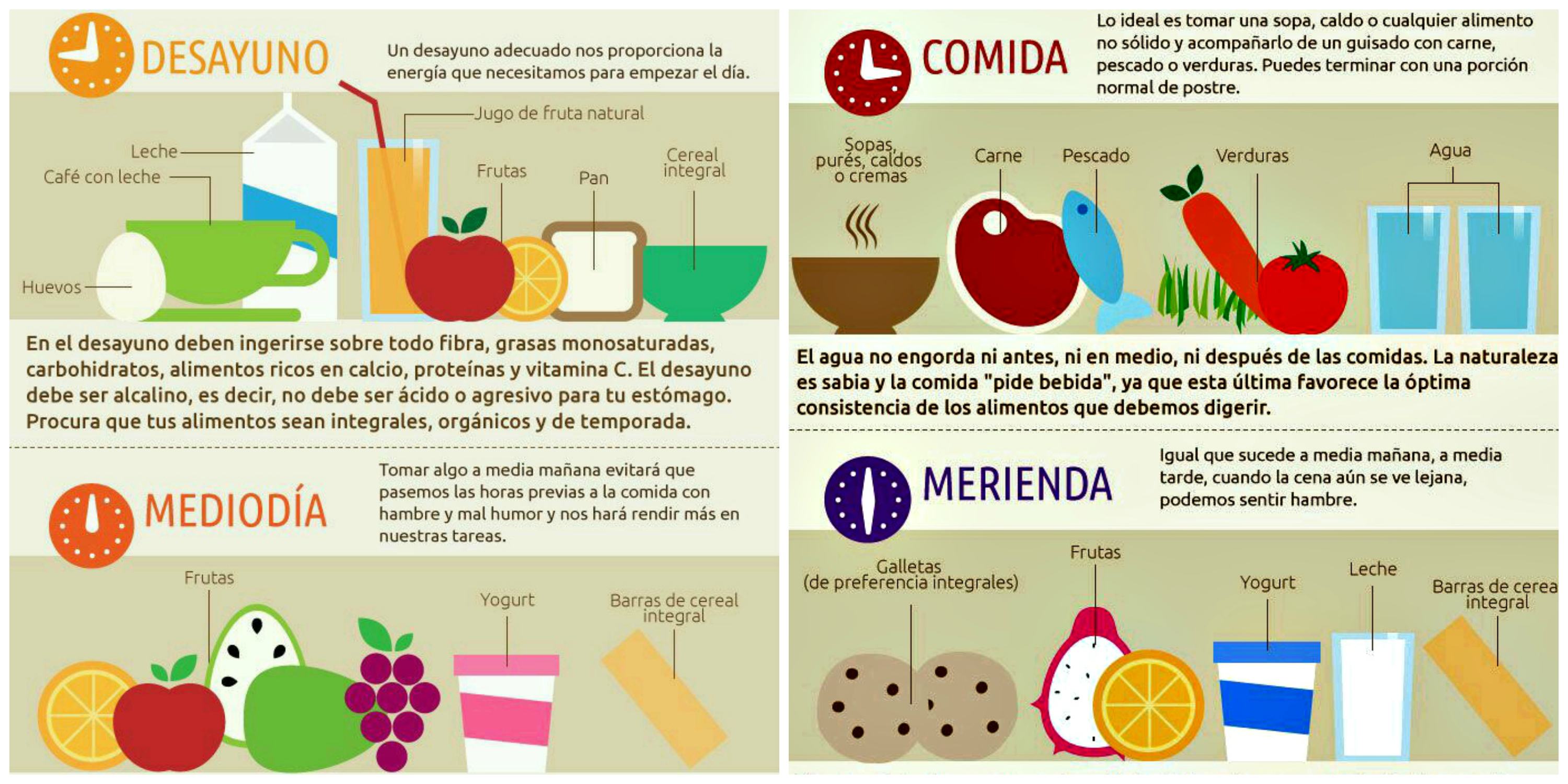 No pases periodos muy prolongados sin alimento y procura no saltarte la hora de comida, aunque tengas mucho trabajo. Puedes preparar algo en tu casa y llevarlo a la oficina para no perder tanto tiempo. Suspende por algunos momentos tus labores y a comer. Una dieta saludable debe ser completa, equilibrada, suficiente, inocua y variada, sabrosa deberíamos agregar, y tu cuerpo necesita que realices todas las comidas del día, incluyendo una ligera a media mañana y una a media tarde, así te sentirás más saciada/o y no sentirás tantos antojos. Ten en cuenta que las comidas principales debes hacerlas bien y completas, especialmente el desayuno.
