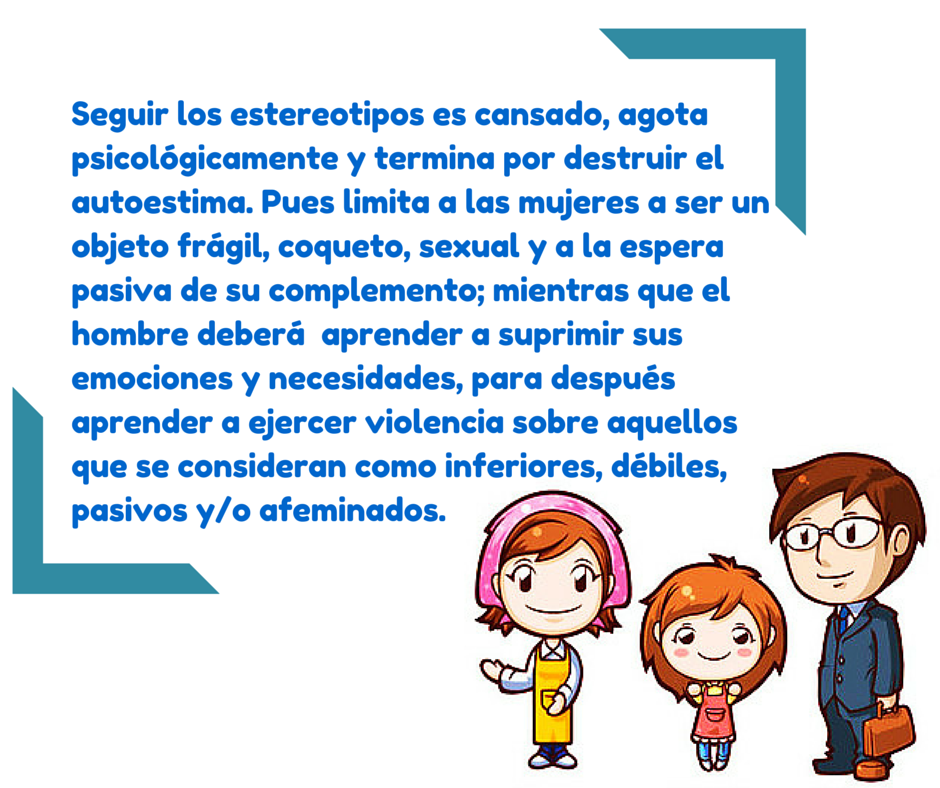 Así los estereotipos están presenten en casi todo, desde los cuentos infantiles, los juguetes, las aplicaciones (app) hasta la publicidad, las cuales enfatiza diariamente la forma de comportarse y se refuerzan con la conducta de mamá y papá, de la forma en que nos desenvolvemos en casa, de la forma en que nos relacionamos con nuestros hijos, de la forma en que nos comunicamos. Este tipo de relaciones y conductas enseñará al niño y a la niña aceptar un lugar y forma predeterminada de ser, y en caso de no cumplir con dicha asignación será sancionados socialmente mediante etiquetas, así cuando alguien se comporte de determinada manera se dirá: