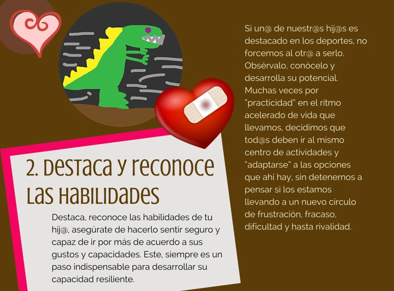 “Los niños y las niñas resilientes soportan las presiones que la escuela ofrece más eficazmente que los menores que no lo son, pero desarrollar esta capacidad es tarea diaria para los padres de familia. Es una labor que no corresponde a la escuela, es en casa donde ell@s encontrarán la seguridad y confianza para ir aprendiendo a fortalecerse internamente para afrontar los desafíos que representa la vida escolar y posteriormente, todo lo que en la vida adulta se les presente como reto o dificultad.”